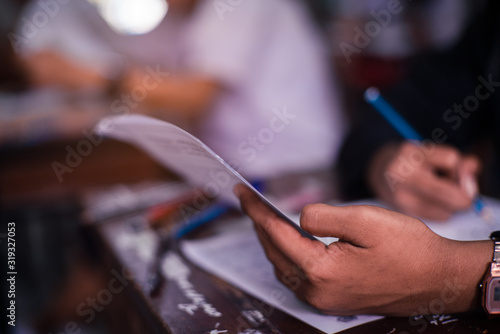 Hand of Student doing test or exam in classroom of school with stress