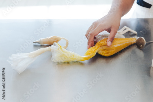 Hand on pastry bags with colored cream inside for making decorated flower for cake.