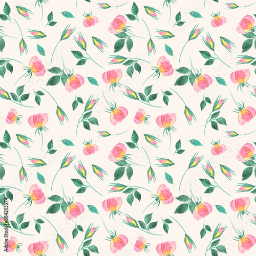 Hand painted pink yellow gradient colored roses with green leaves as summer spring seamless pattern on beige background for print cards, invitations, scrapbooking and wrapper.