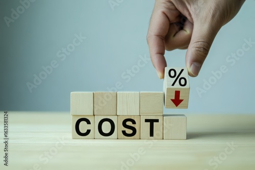 cost, reduction, savings, decrease, financial, economy, budget, expense, management, business, finance, investment, percentage, cube, block, hand, concept, strategy, growth, profit, loss, money, value, efficiency