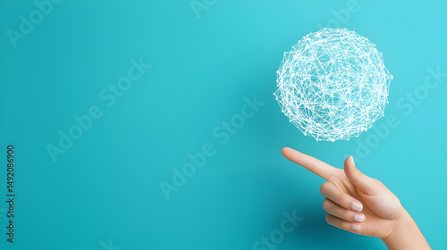 Hand Pointing at Floating Abstract Sphere on Turquoise Background