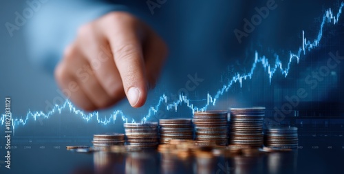 hand, pointing, finger, stack, coin, money, finance, financial, graph, chart, rising, upward, trend, growth, investment, economy, business, success, wealth, profit, currency, cash, value, market, stock, trade, banking, savings, capital, income, earning, budget, analysis, datum, statistic, digital, technology, blue, background, depth, sharpened, detail, blurred, abstract, conceptual, future
