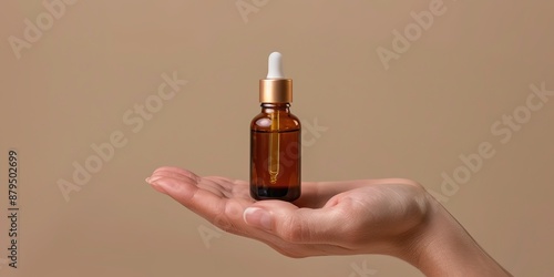 Hand presenting serum bottle against neutral background, space f