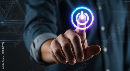 Hand pressing glowing power button on futuristic interface, symbolizing activation and technology.