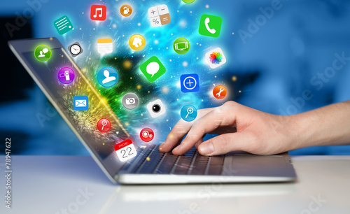 technology, mobile, computer, notebook, cyberspace, app, cloud, touch, computing, network, icon, concept, phone, tablet, communication, social, laptop, screen, man, application, white, background, hand, display, media, wireless, modern, smartphone, work, web, electronic, device, pad, information, future, online, business, equipment, digital, connection, tech, keyboard, innovation, software, symbol, press, colourful, new, enter