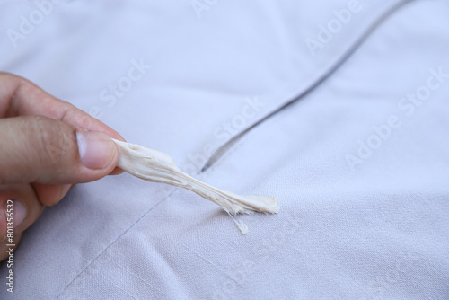 hand pulling gum stick on pants from accident in daily life. dirty stain for cleaning concept.
