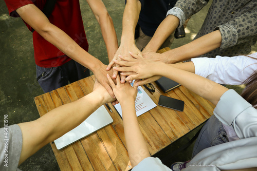 Hand team of cooperation in the construction business.To succeed in developing sustainable partnerships.concept