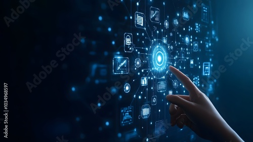 Hand touching a digital screen with icons of technology and online network connection, cloud storage, or security system on a dark blue background