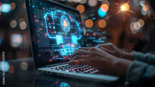 Hand typing on a laptop with holographic warning symbols on screen environment, concept of cybersecurity