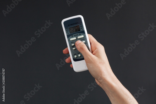 Hand using a remote control to activating air conditioning on the dark background