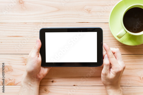 hand using tablet computer with blank white screen on wooden background