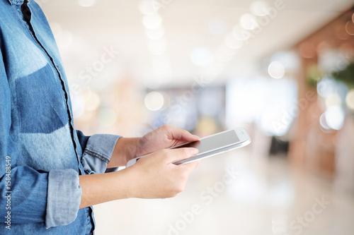 Hand using tablet over blur store with bokeh light background, banner, business and technology concept, digital marketing, seo, e-commerce