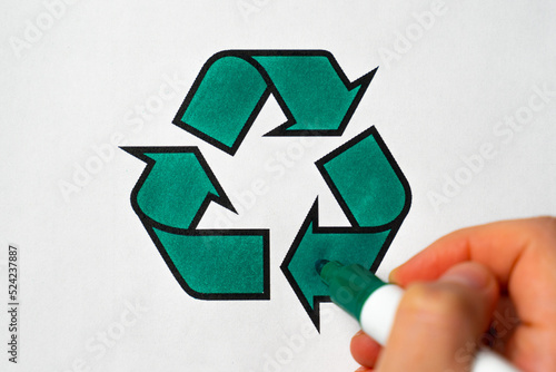 Hand with a green marker circles a garbage recycling sign on white paper.