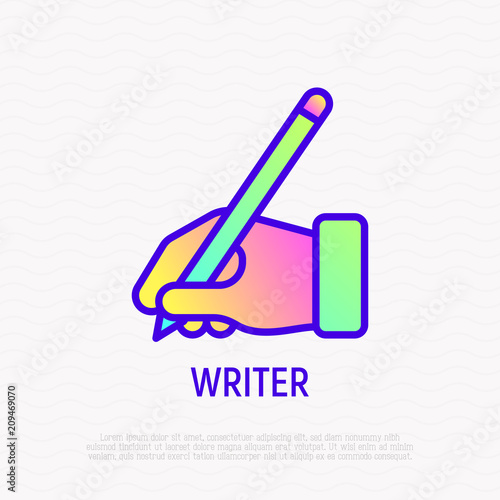 Hand with pen thin line icon, writer sign. Modern vector illustration.