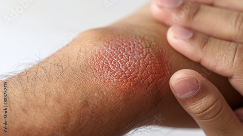 Hand with psoriasis or itchy rash patch, showing inflamed and scaly skin.