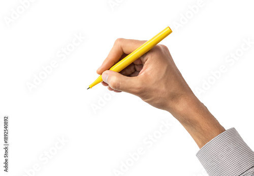 Hand with yellow marker in downward writing position, isolated on a transparent background