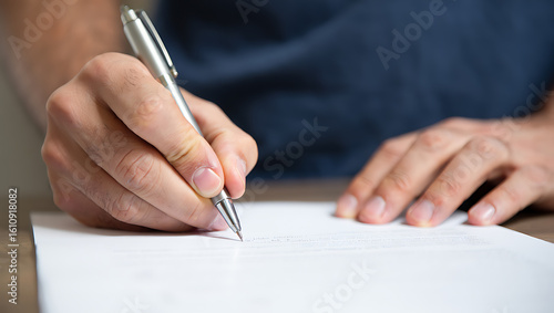 hand, writing, pen, paper, document, signing, business, office, detail, closeup, person, finger, blue shirt, table, sharpened, indoor