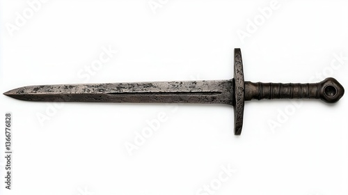 Handandahalf longsword with a dark leather hilt, a sharp shining blade, and a battleworn aesthetic, isolated on white