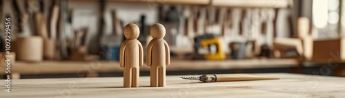 Handcrafted wooden figures symbolize creativity and craftsmanship in a workshop setting.
