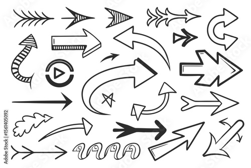 Hand-Drawn Arrows Set for Navigation and Infographics. Curved, Circular, and Swirled Arrow Vector Icons for UI Design Elements, Presentation Templates, and Branding.