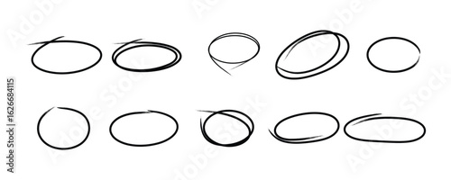 Hand-Drawn Black Circle and Oval Highlight Elements — Charcoal Pen and Marker Style Scribble Ellipses, Doodle Round Shapes for Emphasis, Annotation, and UI Highlight on White Background