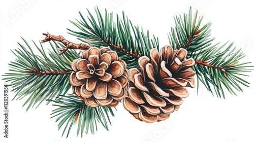 Hand-drawn botanical illustration featuring a pine cone and fir tree set. Intricate engraving depicts isolated Christmas pinecones. Perfect for creating holiday cards, backdrops,