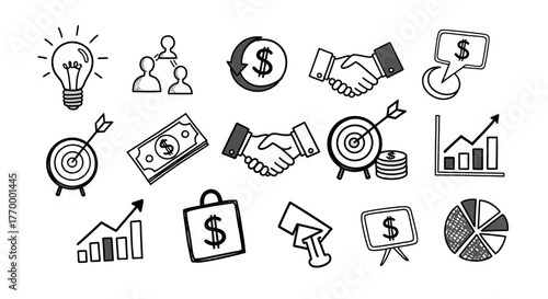 business, finance, icon, hand-drawn, vignetting, growth, success, money, target, graph, light bulb, handshake, dollar, investment, strategy, planning, market, economy, profit, chart, diagram, presentation, idea, teamwork, agreements, deal, currency, cash, banking, wealth, management, analysis, report, statistic, illustration, drawing, vector, symbol, signs, element, design, concept, creative, art, doodle, outline, iconography, set, collection