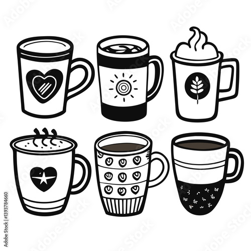 Hand-Drawn Coffee Cup Doodle Set – 6 Unique Black and White Illustrations