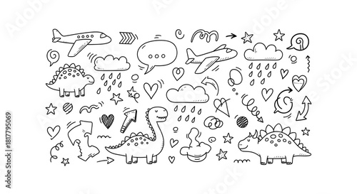 dinosaur, aeroplane, cloud, nubes, doodle, memory, visual, imagination, ornate, peace, idea, inspiration, friendship, together, artistic, feeling, graphic, embellishment, kindness, artwork, playful, express, joy, positive, drawing, creativity, love, fun, hand-drawn, celebrate, happy, children, vignetting, shape, emotion, care, baby, wallpaper, cartoon, element, modern, art, abstract, flight, symbol, cute, concept, holiday, sky