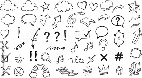 doodle, drawing, hand-drawn, vignetting, vector, illustration, element, design, decoration, cloud, arrow, nubes, speech bubble, question mark, exclamation mark, cross, star, rainbow, crown, crystal, symbol, icon, set, collection, graphic, art, artistic, outline, line, scribble, swirl, curly, whimsical, cute, fun, playful, childlike, hand-made, marker, pen, crayons, background, clip art, scrapbook