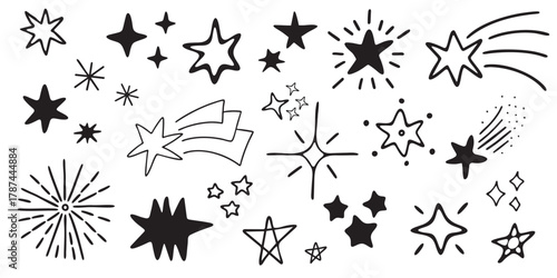Hand-drawn doodle stars and comets set. Collection of sketch-style star shapes, sparkles, and comets for design projects, clipart, or decorative celestial elements