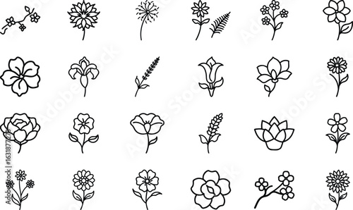 Hand-drawn flower icon bundle set with 24 unique floral illustrations in black line art style for design and decoration
