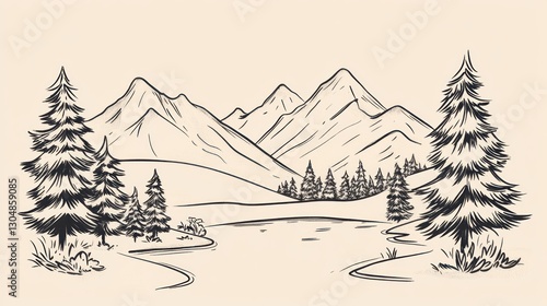 mountain, landscape, nature, forest, lake, tree, river, scenery, drawing, vignetting, illustration, winter, mountain chain, pine, vale, hill, background, calm, art, vintage, sketchy, line art, simple, elegant, classic, hand-drawn, design, background, relaxing, peaceful, scenic, view, quiet, travel, adventure, explore, wanderlust, calmness, serenity, picturesque