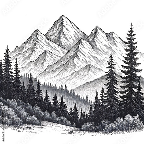 Hand-Drawn Nature Illustration of Mountains and Forest