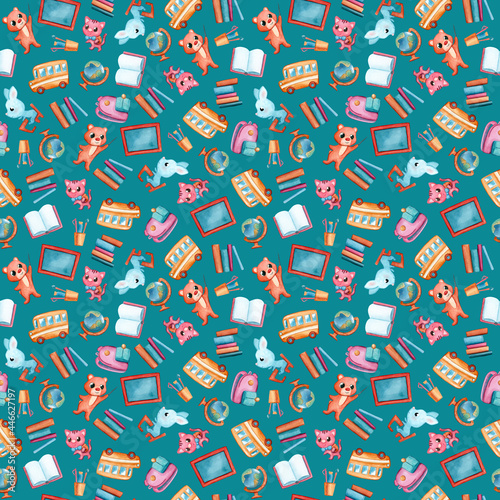 school, book, watercolor, seamless, pattern, cute, amiable, animal, background, backpack, bear, rabbit, bus, cat, character, children, class, colours, drawing, education, fabric, first, globe, green, hand-painted, hand-drawn, happy, illustration, children, kitten, learn, childcare center, object, paper, preschool, print, rabbit, repeatable, square, student, study, swatch, textile, tile, tileable, tool, vintage, wallpaper, watercolor