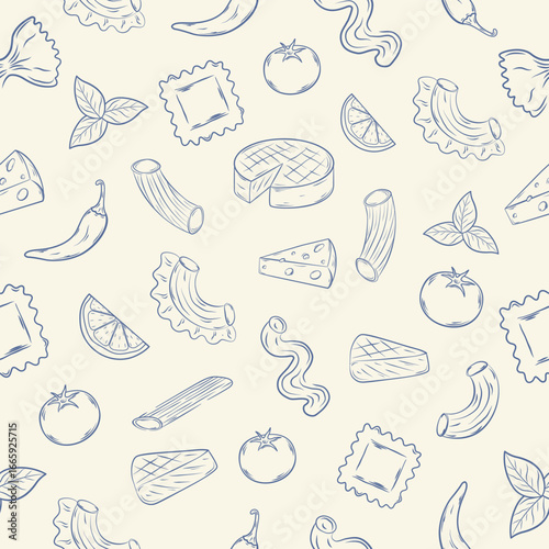 Hand-drawn seamless pattern with tomatoes, Italian pasta, and cheese. Vector illustration.