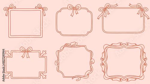 Hand-drawn set of elegant decorative frames with bows and ribbons on a pink background.