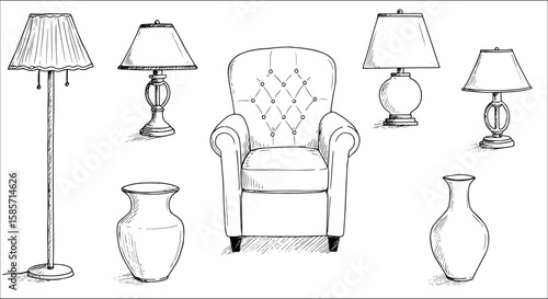 Hand-drawn sketch of various home interior elements: classic lamps (floor table), a tufted armchair, and decorative vases, illustrating a cozy and elegant living space.
