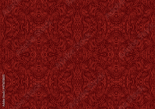 Hand-drawn unique abstract symmetrical seamless ornament. Bright red on a deep red background. Paper texture. Digital artwork, A4. (pattern: p03b)