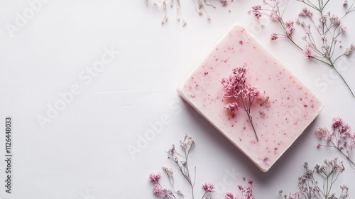 Handmade floral soap bar surrounded by delicate dried flowers on a clean white acrylic background