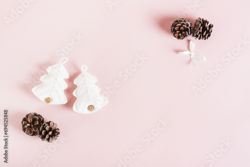 christmas, fir, knitted, hand-made, advertising, background, card, celebration, cone, copy space, cosy, december, decor, decoration, design, event, festive, greeting, happy, hobby, holiday, home, invitation, lifestyle, light, merry, new, party, pink, presentation, simple, table, template, topview, traditional, tree, trend, winter, wooden, christmas, year, white, bow