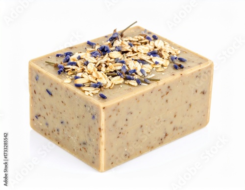 Handmade Soap Bar with Oats and Lavender on White Background, Natural Skincare.