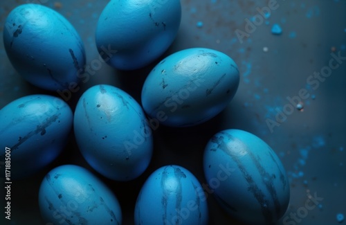 Hand-painted blue Easter eggs on dark background. Stylish minimal composition. Top view flat lay. Festive, spring-themed decor. Handmade eggs look original, colorful. Unique design with hand-made