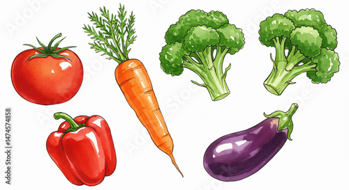 watercolor, vegetable, tomatoes, carrot, broccoli, pepper, aubergine, healthy, vegan, food, organic, colourful, hand-painted, illustration, white background, fresh, cooking, grocery, garden, nourishment, vegetarian, farm, natural, produce, still life, farmers market, environmentally friendly, culinary, raw food