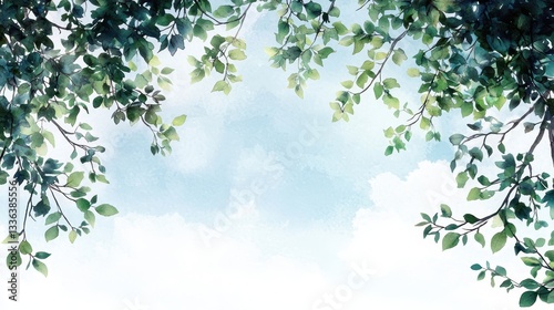 Hand-Painted Watercolor Tree Borders with Lush Green Leaves and Soft Blue Sky Background