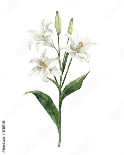 lily, white lily, watercolor, spring flower, leaf, stem, hand-painted, isolated, white background, spring, elegant, delicate, natural, wedding flowers, greeting card, seasonal, no people