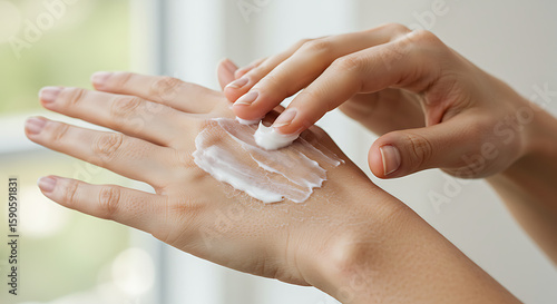 Hands applying moisturizing cream on dry skin, with soft background and natural lighting.