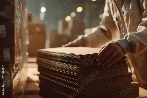 Hands arranging a stack of flattened cardboard boxes in an industrial or warehouse setting.