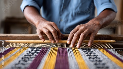 Hands carefully weaving colorful threads on a traditional loom, showcasing skilled craftsmanship and cultural textile art.