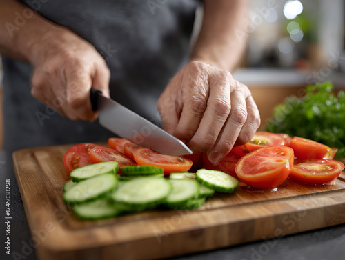 hand, chopping, vegetable, tomatoes, cucumber, kitchen, cutting, board, food, preparation, healthy, cooking, meal, ingredient, culinary, knife, fresh, organic, cookery, lifestyle, home, domestic, workspace, wooden, surface, texture, detail, closeup, action, skill, hobby, nourishment, vibrant, colours, atmosphere, ambience, freshness, culinary arts, kitchen utensile, utensil, chef, epicure, receipe, chopping board